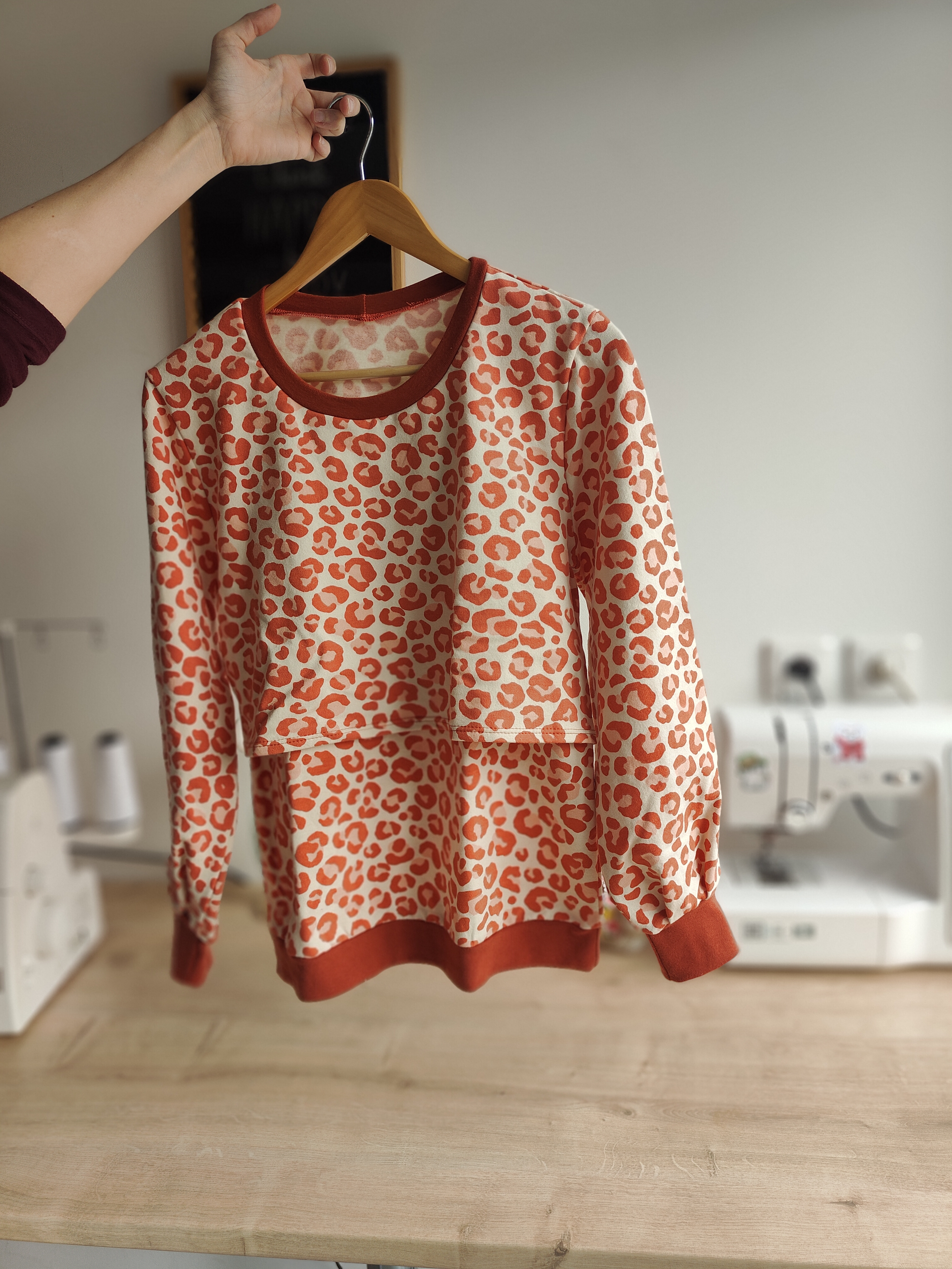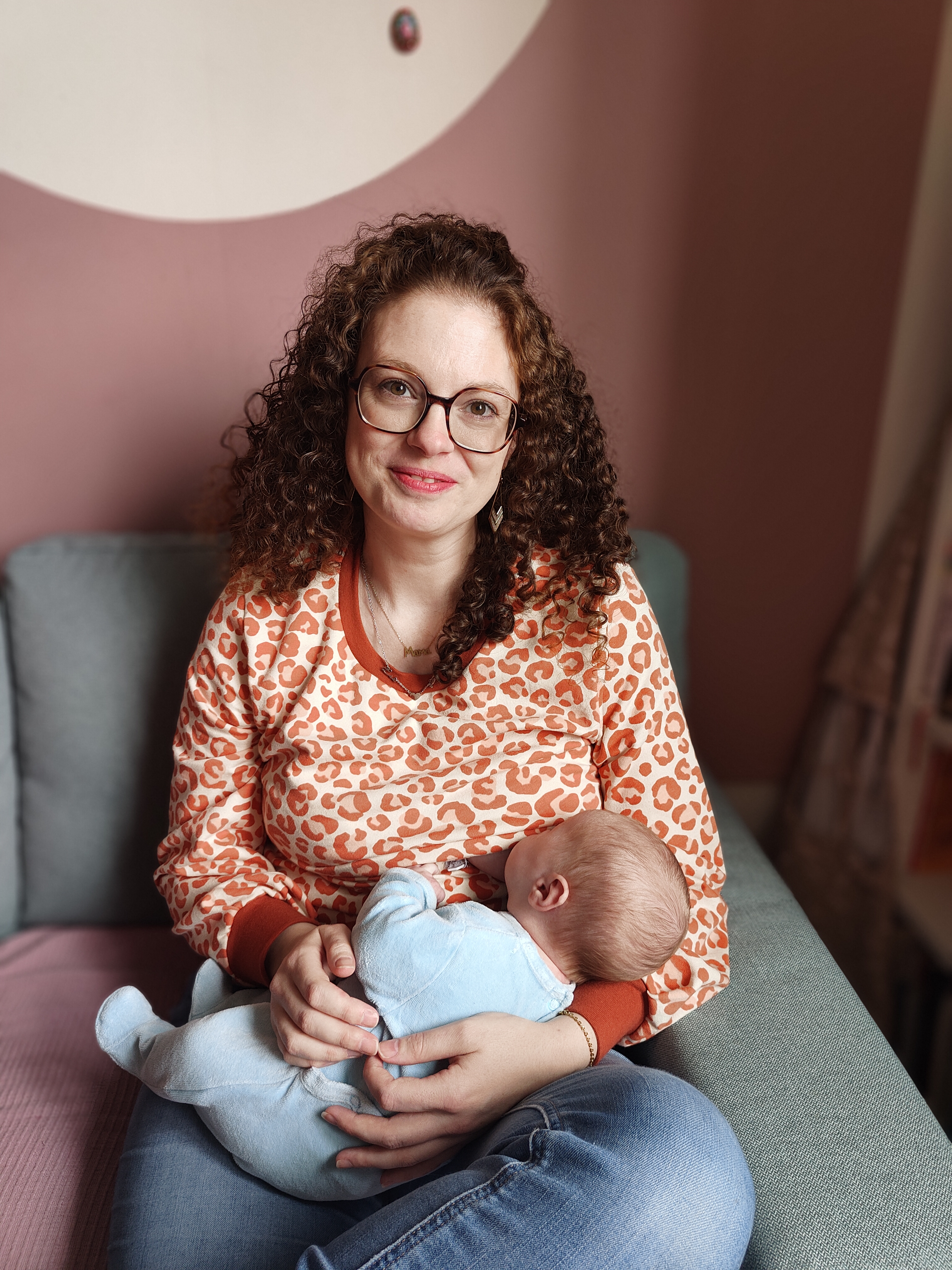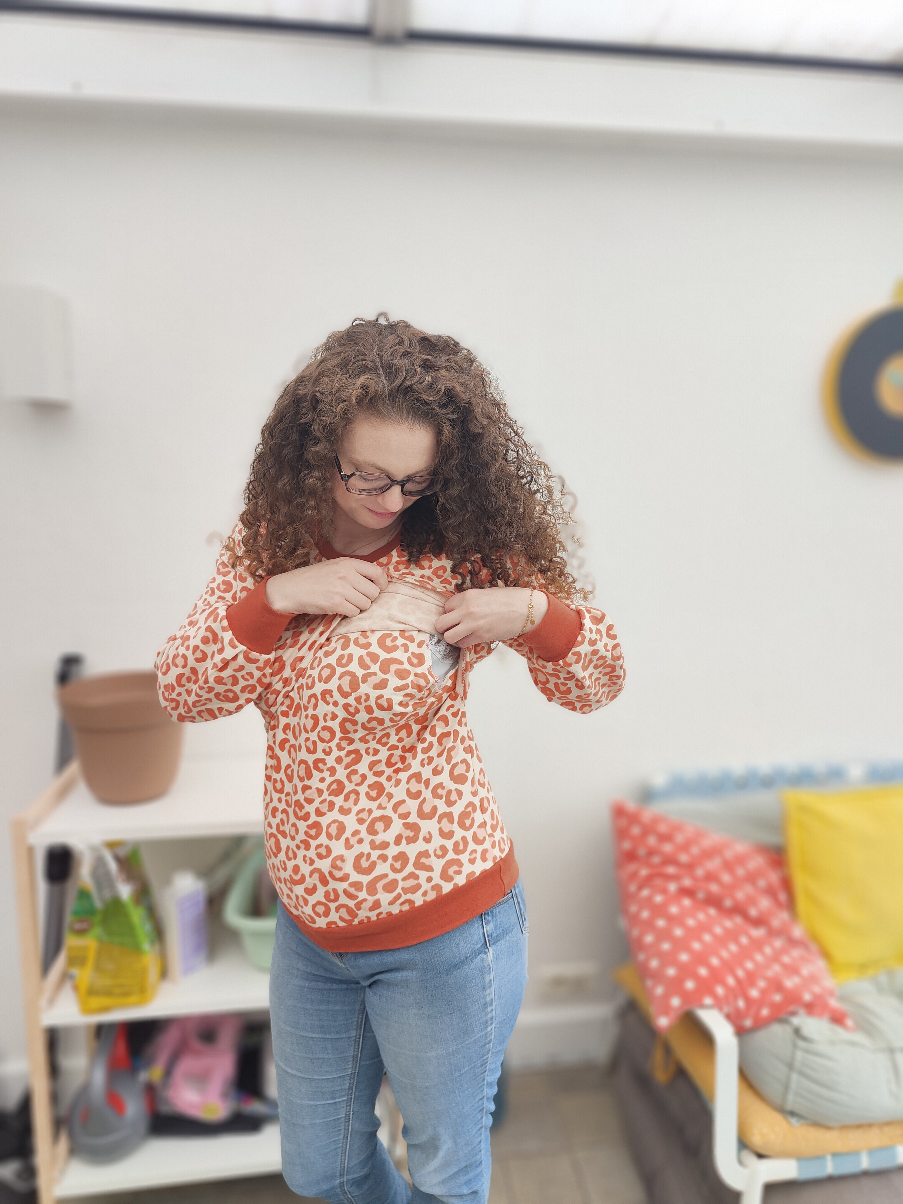 Le sweat d’allaitement Graou, version tétée discrète, allie le caractère du motif léopard au confort d'une coupe enveloppante, rehaussée par un col et des bordures en tissu Terracotta. Conçu dans un molleton de coton biologique épais, il est l'allié des moments de douceur. L’ouverture d’allaitement est entièrement dissimulée : un débardeur intégré est caché sous un tablier élégant. Ce système de superposition permet de soulever le pan supérieur d'un geste fluide pour allaiter, tandis que le débardeur protège ton ventre et ton buste du froid. Ce modèle offre l'élégance des manches bouffantes à plis, une option signature qui apporte un volume moderne et raffiné à la silhouette. Chaque pièce est fabriquée à la main en très petite quantité, ce qui garantit une création unique et disponible seulement pour quelques mamans.